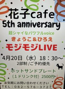 4月20日水曜日に、広島市南区比治山にある花子Cafeというおしゃれな空間で、ひろえさんと二人で奏でます♪